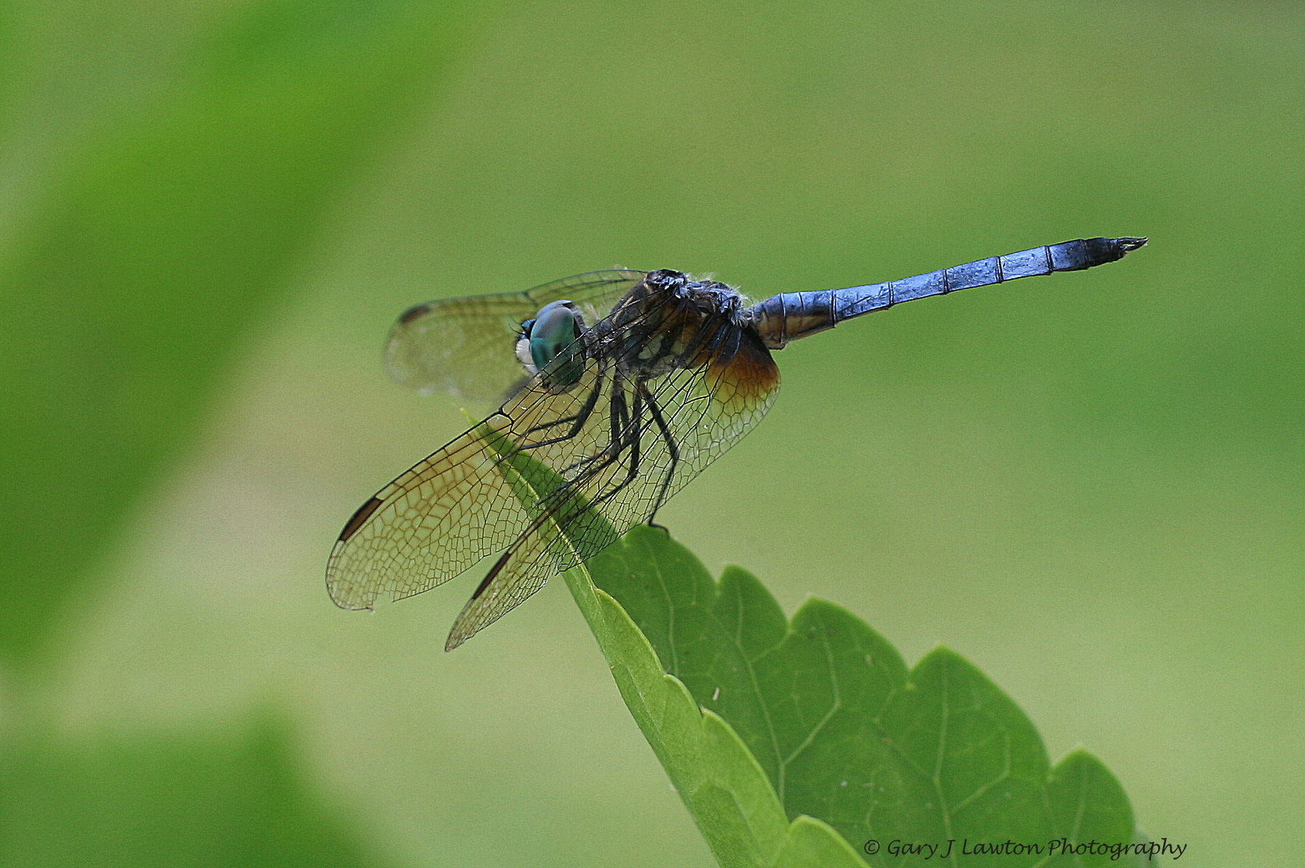 This great blue skimmer caught my eye when I walked out of the house to check my mailbox . It perched on the tip of a hibiscus leaf and tilted its head as if to look at me when I approached it. It was not alarmed at my presence so I took advantage of this opportunity to photograph it and observe its behavior. This skimmer tilted its head and flew up to snatch a smaller insect from the air. It returned to the same leaf, and ate the tiny bug. It continued to “pose” for me as I snapped one picture after another at various settings. I marveled at the geometric shapes on its wings that formed chain-like patterns. Again it lifted off the leaf, but I think it missed its prey because it returned to its perch without a tasty morsel. It remained still, only tilting its head from time to time; I assume something caught its compound eyes. I thanked this beautiful creature for eating pesky bugs and for posing for me.