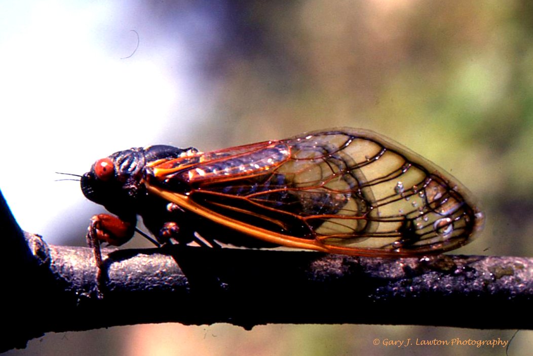 This is the periodical cicada I saw 17 years ago in the oak forests of Long Island. Not the orange eyes.