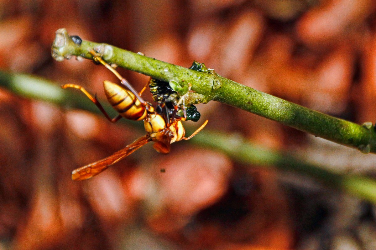 paper wasp eating caterpillar compressed