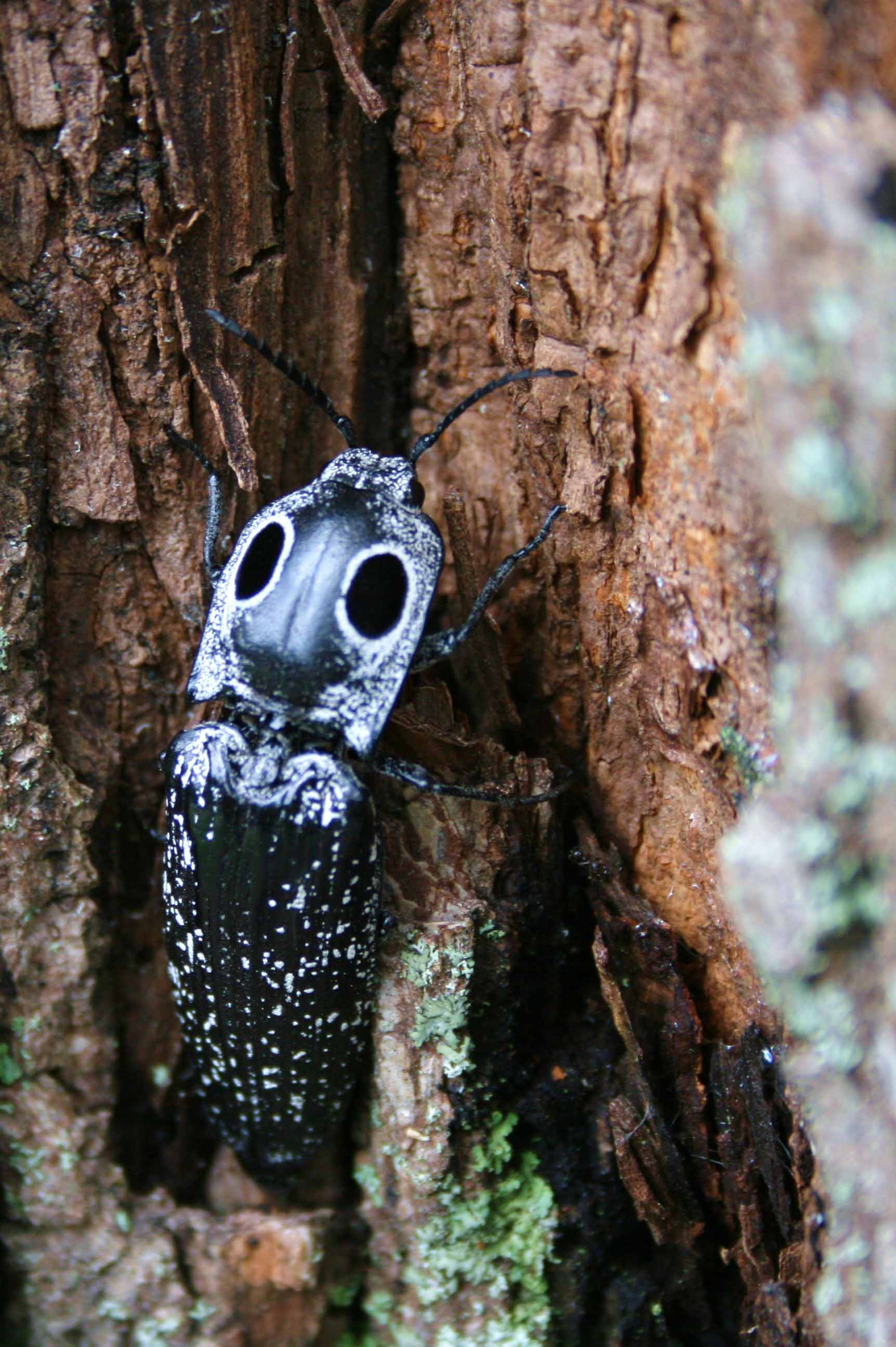 Eastern-eyed click beetles are among the largest in North America. They are distinguished by black bodies with gray and white markings. Their most striking features are their two eyespots and an ingenious form of mimicry to protect themselves from predators.